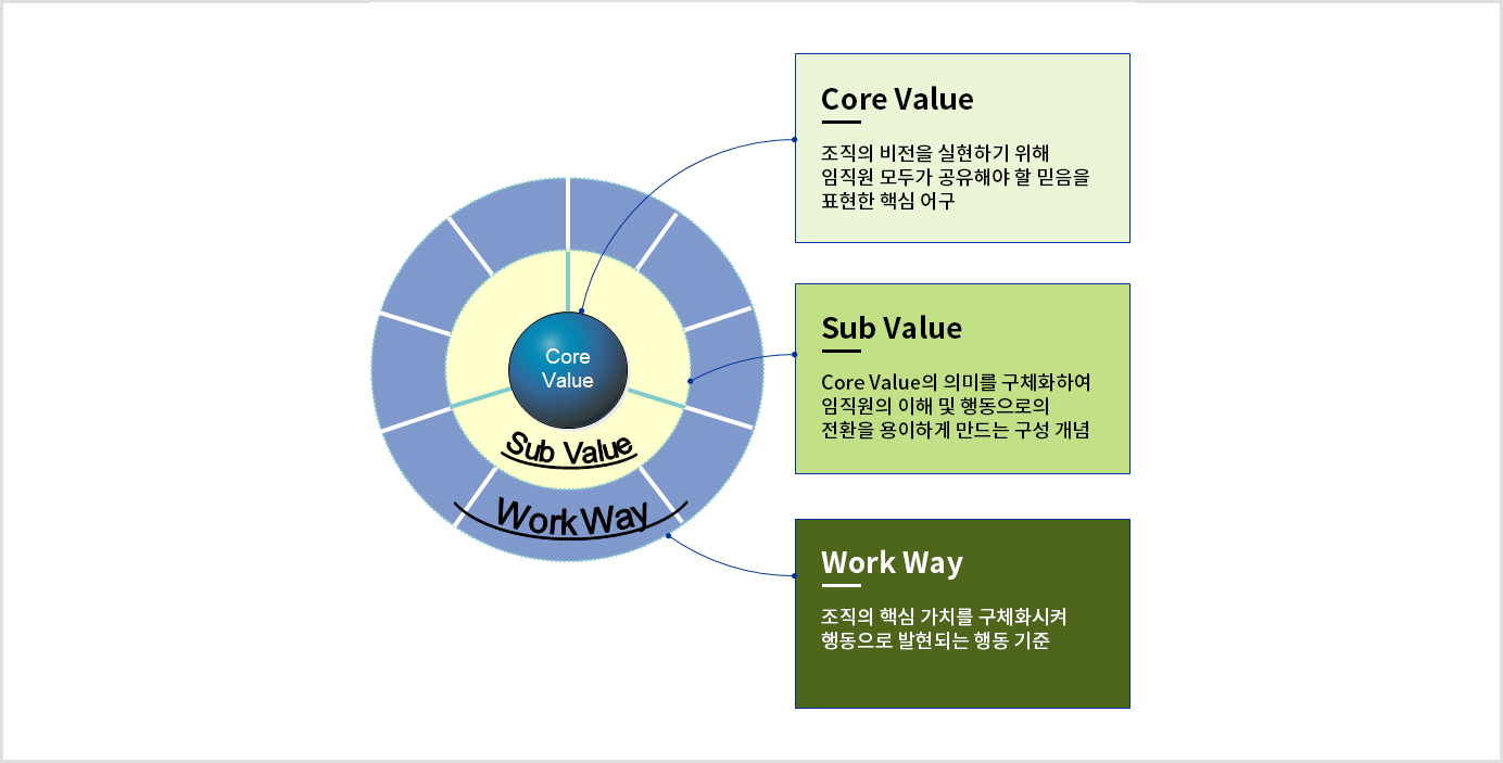바람직한 가치체계 구축을 위해 지향할 ‘Value 체계’는 Core Value, Sub-Value, Work Way로 구성되며, 구체적인 정의를 통해 조직 구성원들에게 공유되어야 함